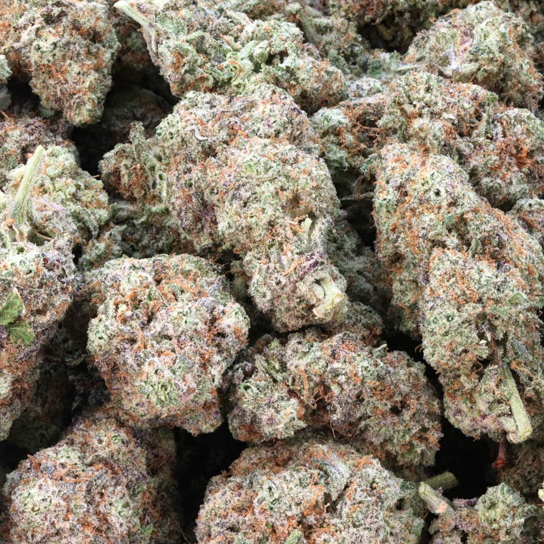Dense, chunky buds with dark green coloring, purple accents, and heavy frost
