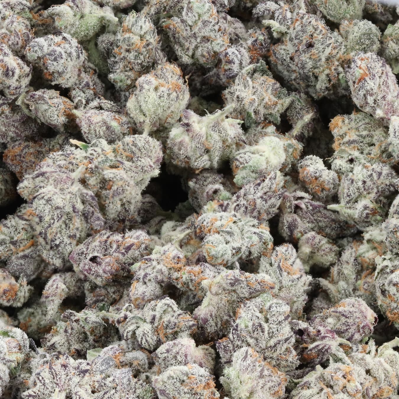 Dense, colorful buds with green and purple hues, heavy trichome production