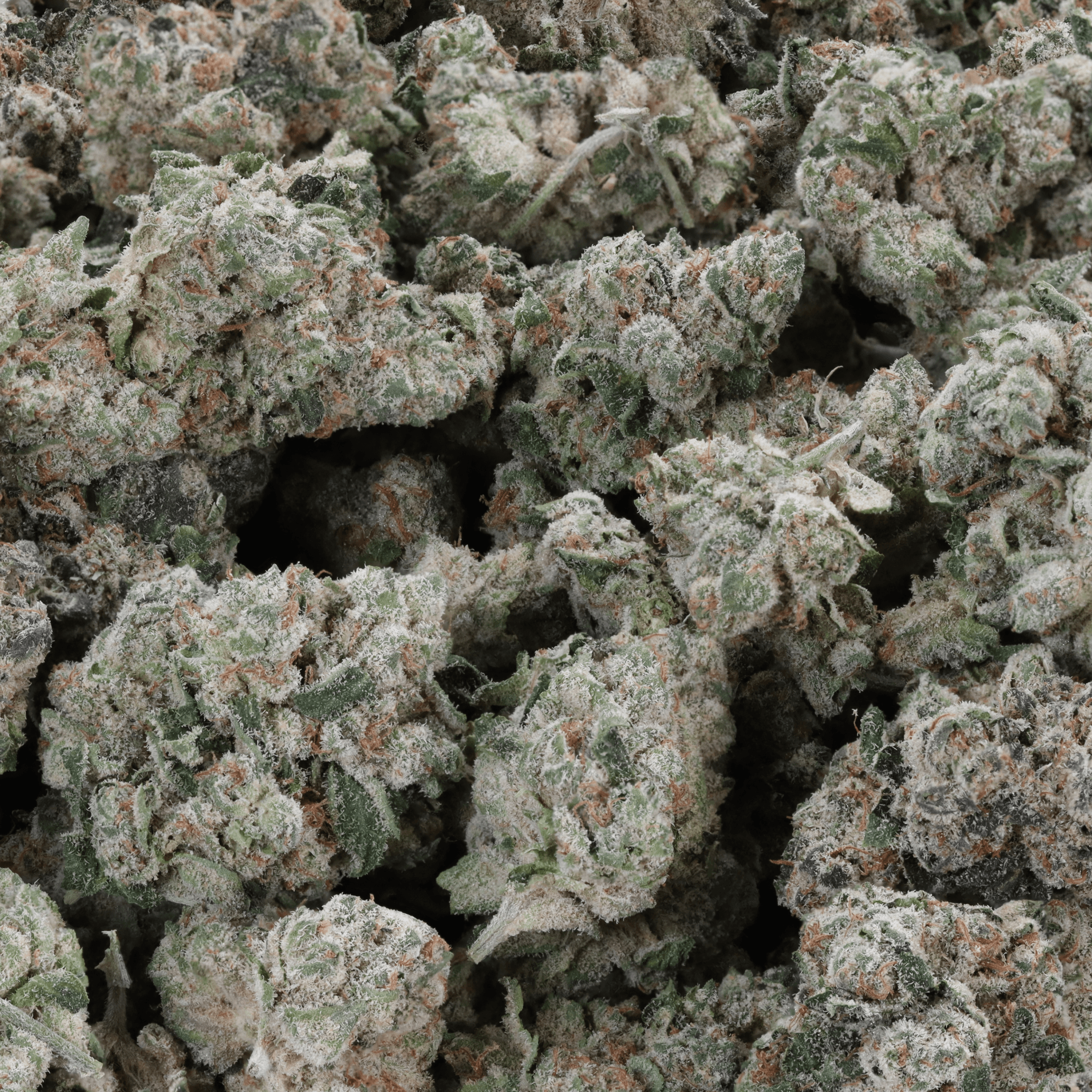 Dense, compact buds with olive green and lavender coloring, frosty trichomes