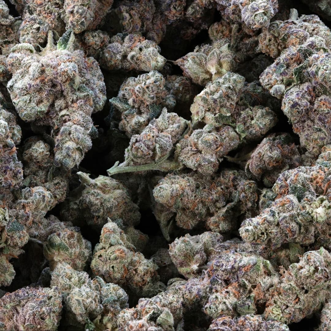 Dense, purple buds with green accents, orange hairs, and frosty trichomes