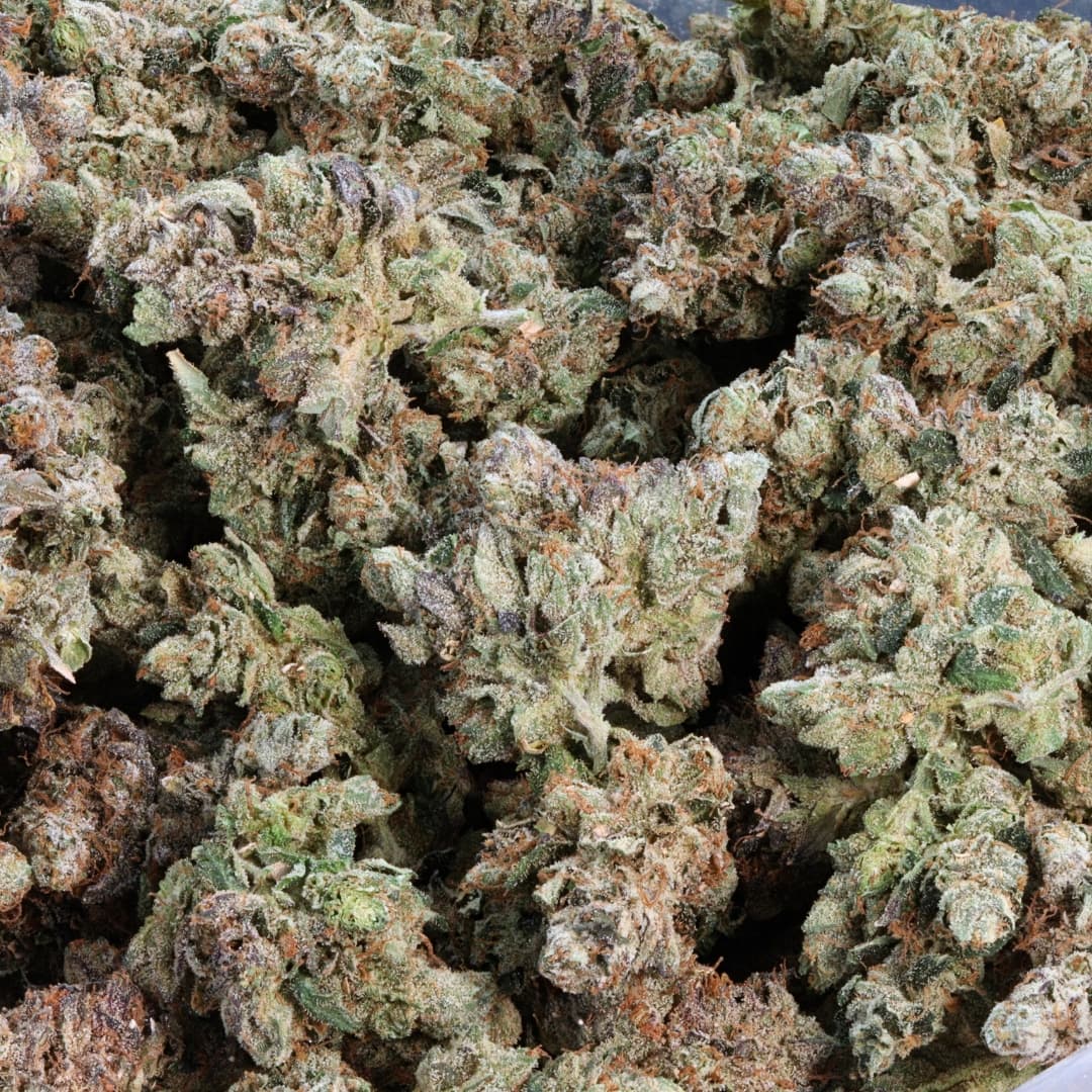 The aroma is rich and sweet, with a slightly pungent edge that comes through once broken up. The buds are dense with olive green tones, purple hints, and a thick coating of frosty trichomes, giving it strong bag appeal and a soft, sticky texture.