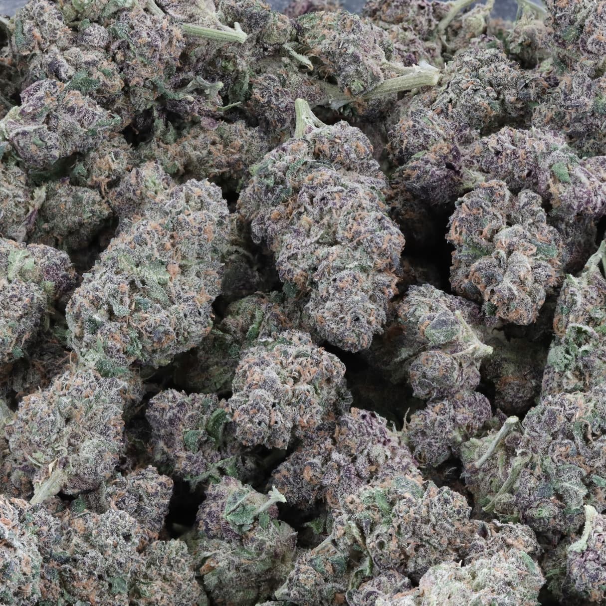 Dense, medium-sized buds with deep green and purple hues, heavy trichome coverage