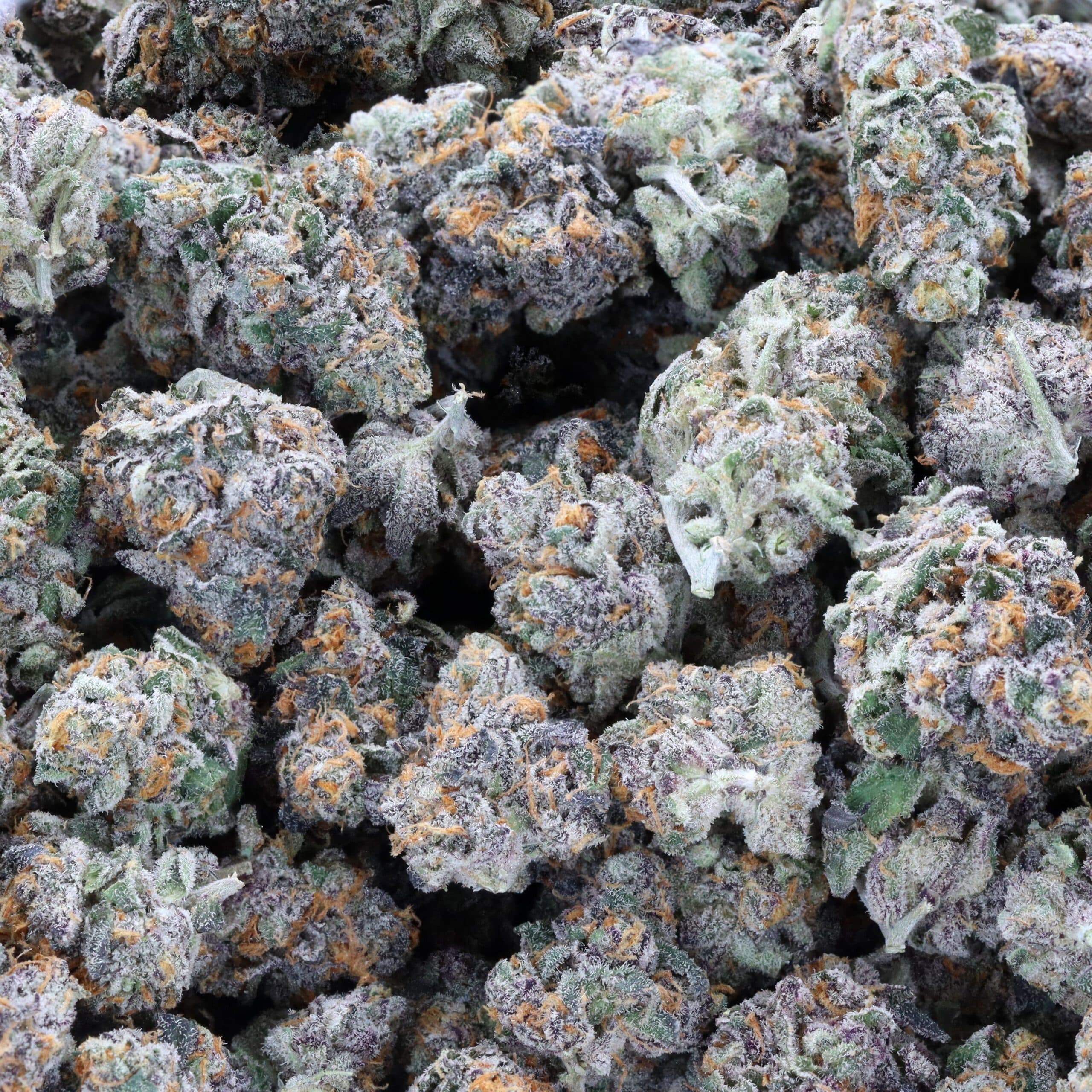 Dense, colorful buds with purple and green hues, bright orange pistils, frosty trichomes