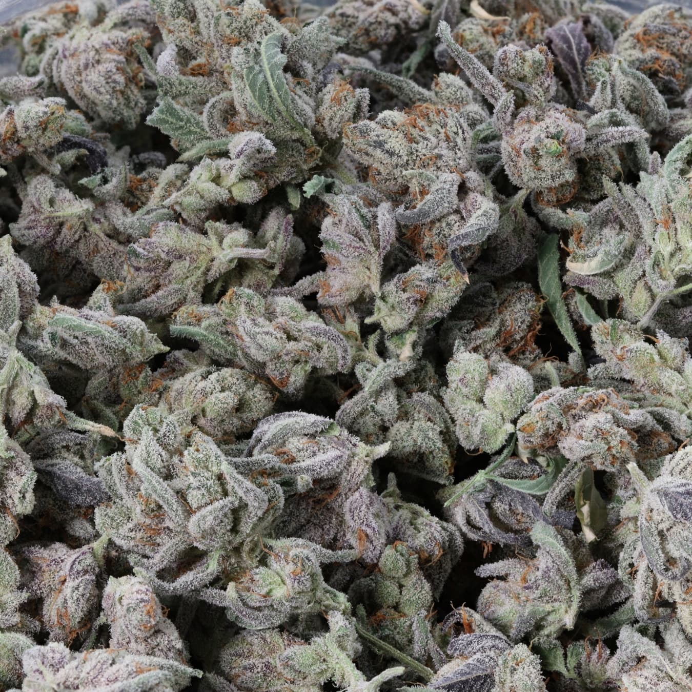 Dense, bright green buds with purple highlights and sparkling trichomes