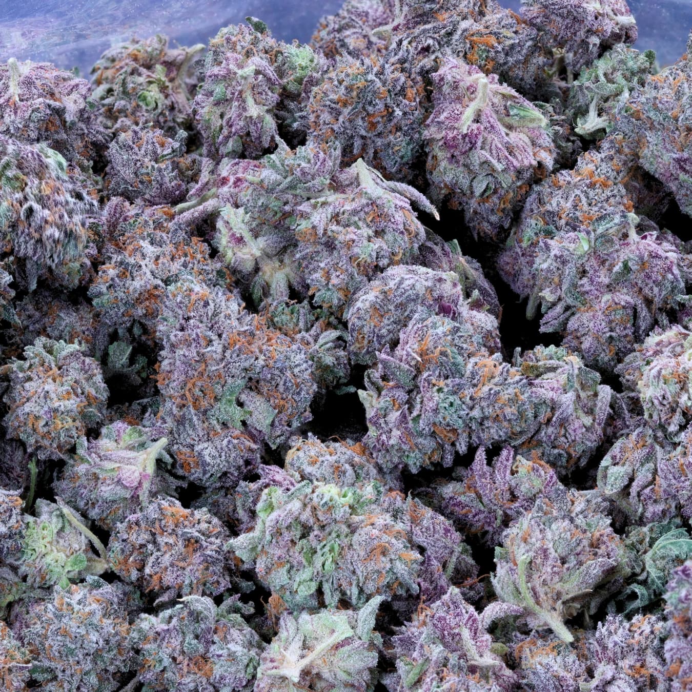 Dense, dark purple buds with green accents and heavy trichome frost
