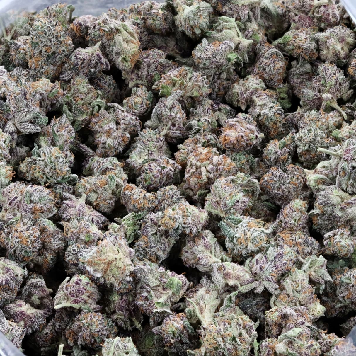 Dense, chunky buds with deep green and purple coloring, thick trichome frosting